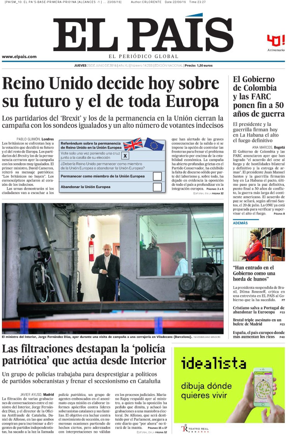 EL PAÍS: "Reino Unido decide hoy sobre su futuro y el de toda Europa"; "Las filtraciones destapan la 'policía patriótica' que actúa desde Interior"; "El Gobierno de Colombia y las FARC ponen fin a 50 años de guerra"; "Dilma Rousseff: "Han entrado en el Gobierno como una horda de hunos".