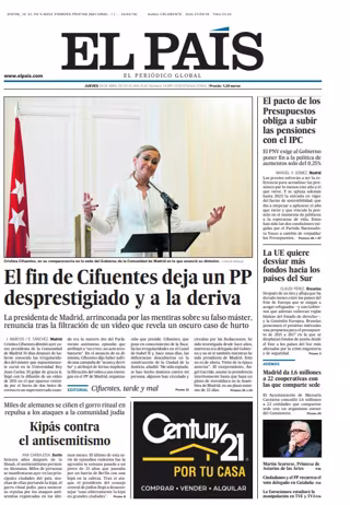 EL PAÍS: "El fin de Cifuentes deja un PP desprestigiado y a la deriva"; "El pacto de los Presupuestos obliga a subir las pensiones con el IPC"; "La UE quiere desviar más fondos hacia los países del Sur"; "Kipás contra el antisemitismo".