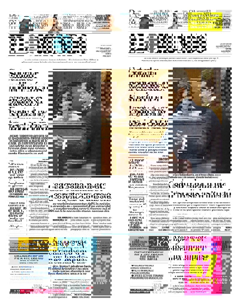 EL MUNDO: "Santander modificará su situación en España si hay tasa a la banca"; "Casado rechaza una cuota de 'sorayistas' en su dirección"; ""Algeciras se está convirtiendo en la nueva Lampedusa". El alcalde José Ignacio Landaluce dice que la masiva llegada de inmigrantes es alarmante e irá a peor"; "El director del CNI dice que Corinna fue grabada bajo amenaza"; "James tendrá que pagar 11,6 millones por fraude fiscal en España".