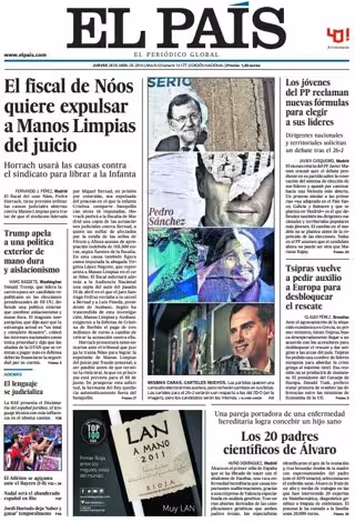 EL PAÍS: "El fiscal de Nóos quiere expulsar a Manos Limpias del juicio"; "Trump apela a una política exterior de mano dura y aislacionismo"; "Los jóvenes del PP reclaman nuevas fórmulas para elegir a sus líderes"; "Tsipras vuelve a pedir auxilio a Europa para desbloquear el rescate".