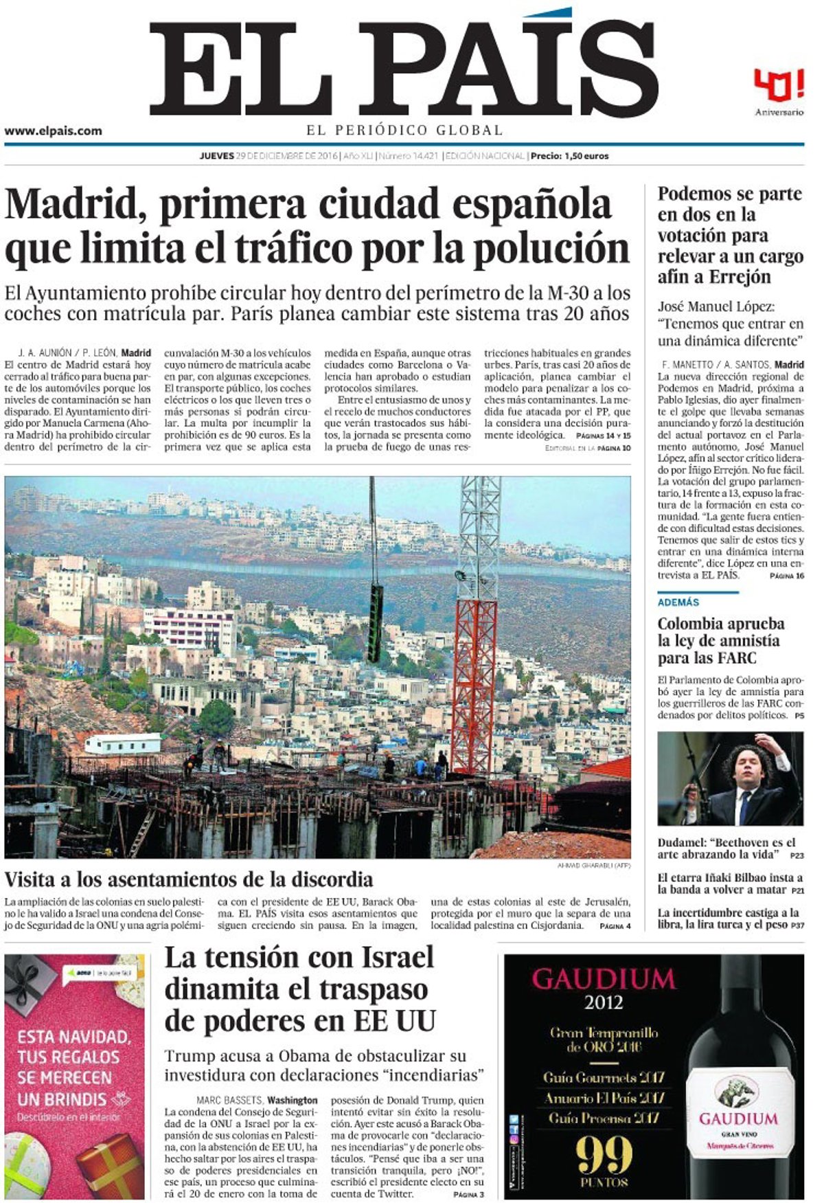 EL PAÍS: "Madrid, primera ciudad española que limita el tráfico por la polución"; "La tensión con Israel dinamita el traspaso de poderes en EE UU"; "Podemos se parte en dos en la votación para relevar a un cargo afín a Errejón"; "Colombia aprueba la ley de amnistía para las FARC".