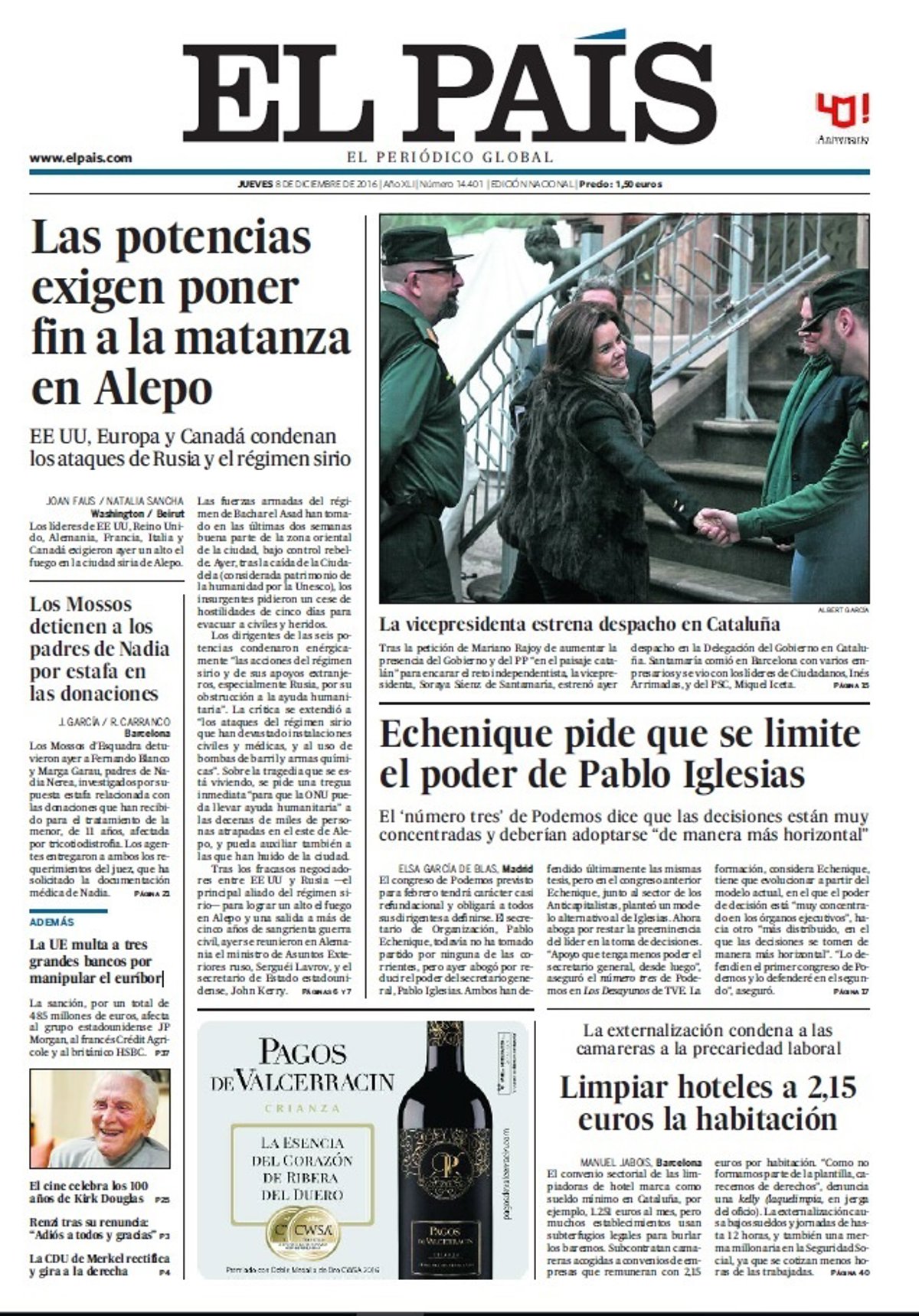 EL PAÍS: "Las potencias exigen poner fin a la matanza en Alepo"; "La vicepresidenta estrena despacho en Cataluña"; "Echenique pide que se limite el poder de Pablo Iglesias"; "Limpiar hoteles a 2,15 euros la habitación. La externalización condena a las camareras a la precariedad laboral"; "Los Mossos detienen a los padres de Nadia por estafa en las donaciones"; "La UE multa a tres grandes bancos por manipular el euríbor".