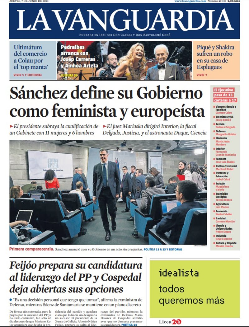 LA VANGUARDIA: "Sánchez define su Gobierno como feminista y europeísta"; "Feijóo prepara su candidatura al liderazgo del PP y Cospedal deja abiertas sus opciones"; "Piqué y Shakira sufren un robo en su casa de Esplugues".