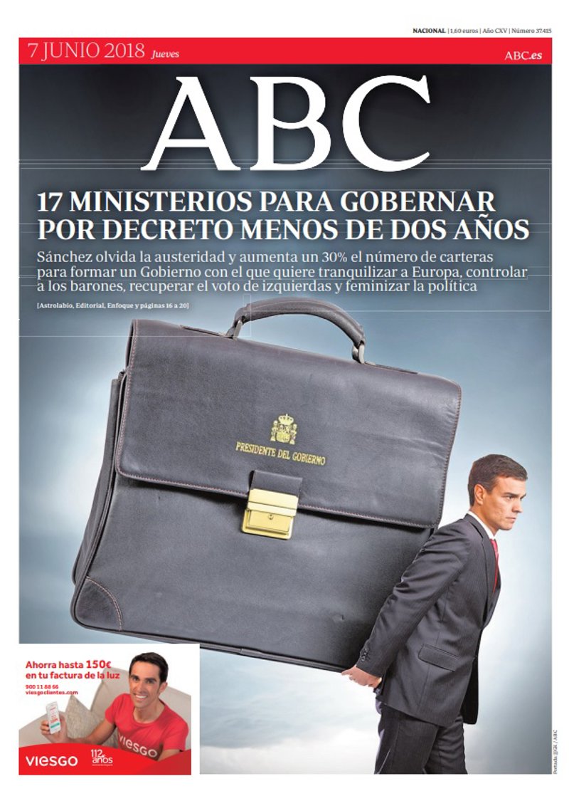 ABC: "17 ministerios para gobernar por decreto menos de dos años"; "Sánchez olvida la austeridad y aumenta un 30% el número de carteras