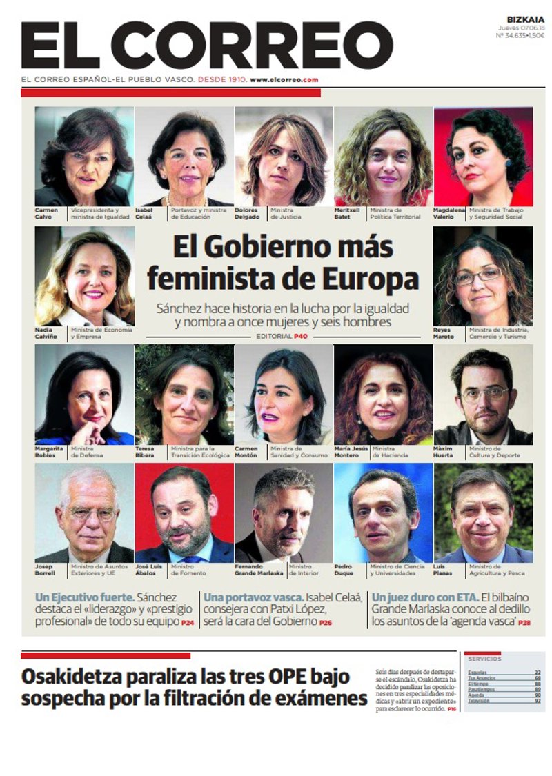 EL CORREO: "El Gobierno más feminista de Europa"; "Sánchez hace historia en la lucha por la igualdad y nombra a once mujeres y seis hombres"; "Osakidetza paraliza las tres OPE bajo sospecha por la filtración de exámenes".
