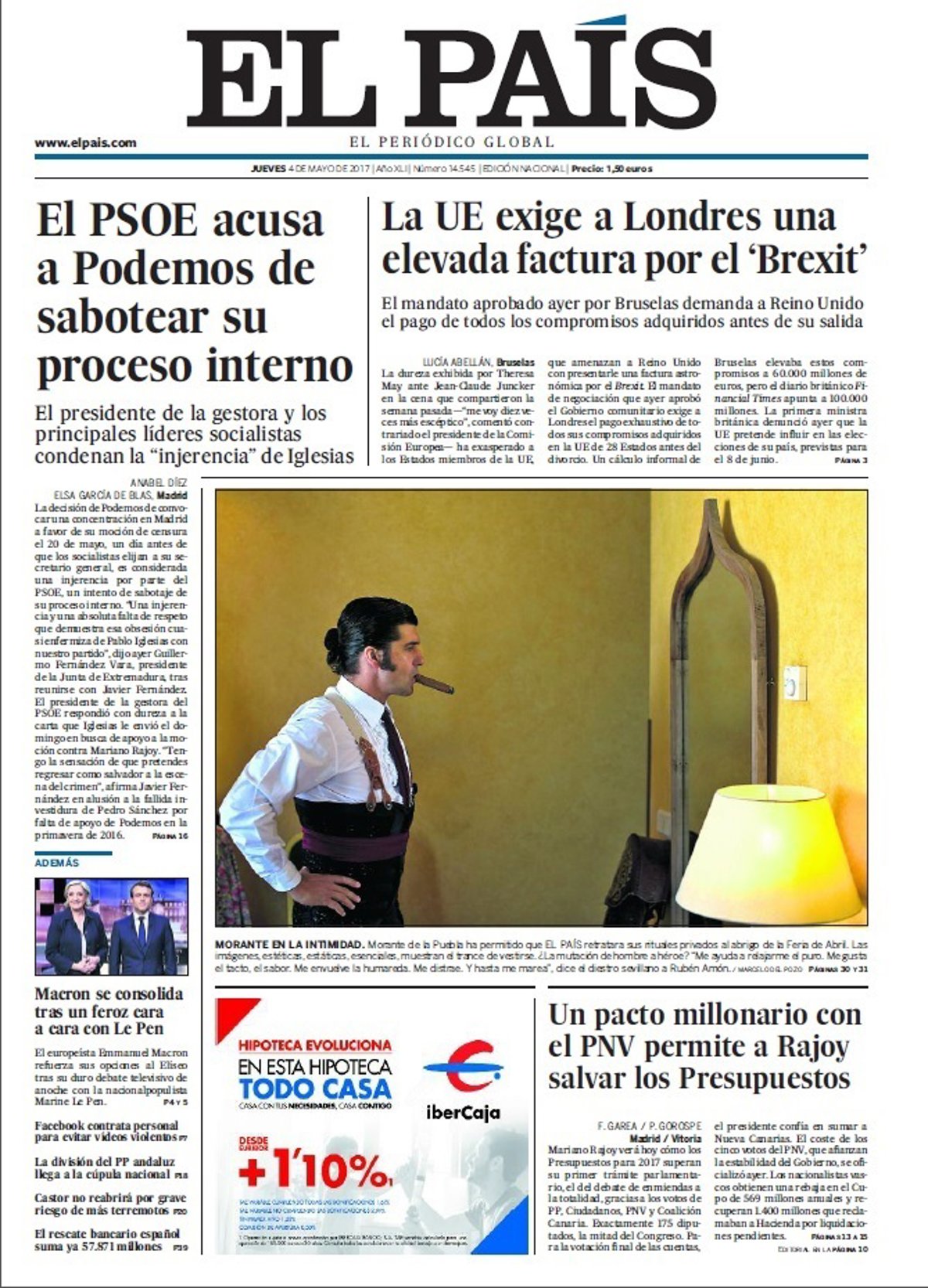 EL PAÍS: "El PSOE acusa a Podemos de sabotear su proceso interno"; "La UE exige a Londres una elevada factura por el 'Brexit'"; "Morante en la intimidad"; "Un pacto millonario con el PNV permite a Rajoy salvar los Presupuestos"; "Macron se consolida tras un feroz cara a cara con Le Pen".