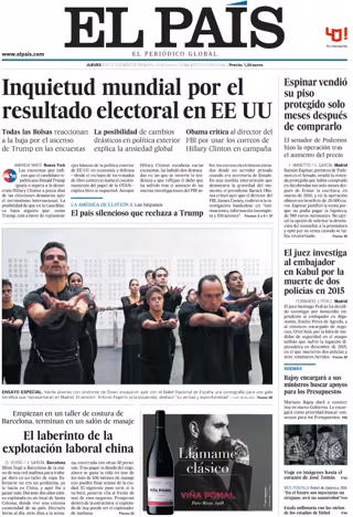 EL PAÍS: "Inquietud mundial por el resultado electoral en EE UU"; "Espinar vendió su piso protegido solo meses después de comprarlo"; "El juez investiga al embajador en Kabul por la muerte de dos policías en 2015"; "Rajoy encargará a sus ministros buscar apoyos para los Presupuestos".