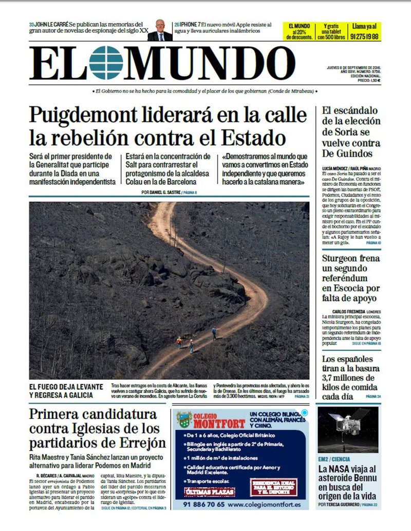 EL MUNDO: "Puigdemont liderará en la calle la rebelión contra el Estado"; "El fuego deja Levante y regresa a Galicia"; "Primera candidatura contra Iglesias de los partidarios de Errejón"; "El escándalo de la elección de Soria se vuelve contra De Guindos"; "Sturgeon frena un segundo referéndum en Escocia por falta de apoyo"; "Los españoles tiran a la basura 3,7 millones de kilos de comida cada día"; "La NASA viaja al asteroide Bennu en busca del origen de la vida".