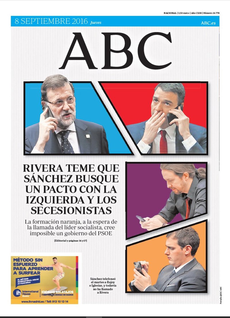 ABC: "Rivera teme que Sánchez busque un pacto con la izquierda y los secesionistas. La formación naranja, a la espera de la llamada del líder socialista, cree imposible un gobierno del PSOE".