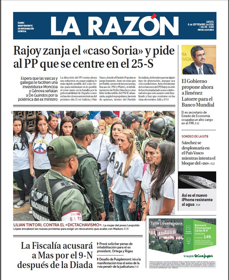 LA RAZÓN: "Rajoy zanja el "caso Soria" y pide al PP que se centre en el 25-S"; "Lilian Tintori, contra el "dictachavismo". La mujer del preso Leopoldo López encabezó las nuevas protestas para exigir un revocatorio que acabe con Maduro"; "La Fiscalía acusará a Mas por el 9-N después de la Diada"; "El Gobierno propone ahora a Jiménez Latorre para el Banco Mundial"; "Sánchez se desplomaría en el País Vasco mientras intenta el bloque del "no""; "Así es el nuevo iPhone resistente al agua".