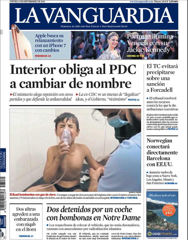 LA VANGUARDIA: "Interior obliga al PDC a cambiar de nombre"; "El Asad bombardea con gas de cloro"; "Dos detenidos por un coche con bombonas en Notre Dame"; "Dos ultras agreden a una embarazada con niqab en el Born"; "El TC evitará precipitarse sobre una sanción a Forcadell"; "Norwegian conectará directamente Barcelona con EE.UU.".