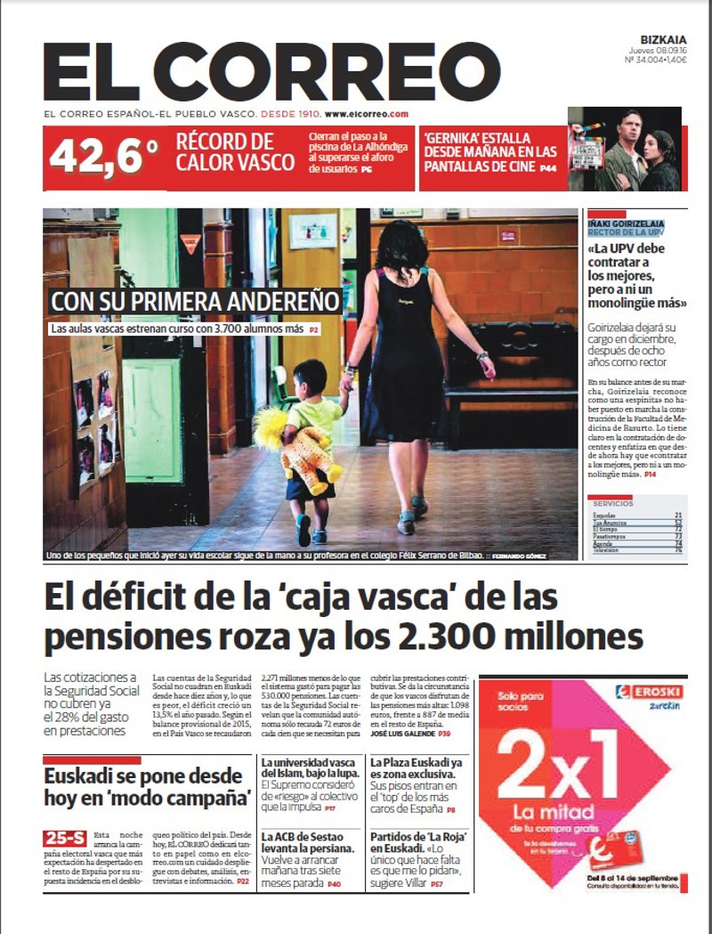 EL CORREO: "Con su primera andereño. Las aulas vascas estrenan curso con 3.700 alumnos más"; "El déficit de la 'caja vasca' de las pensiones roza ya los 2.300 millones"; "Iñaki Goirizelaia, rector de la UPV: "La UPV debe contratar a los mejores, pero a ni un monolingüe más""; "Euskadi se pone desde hoy en 'modo campaña'".