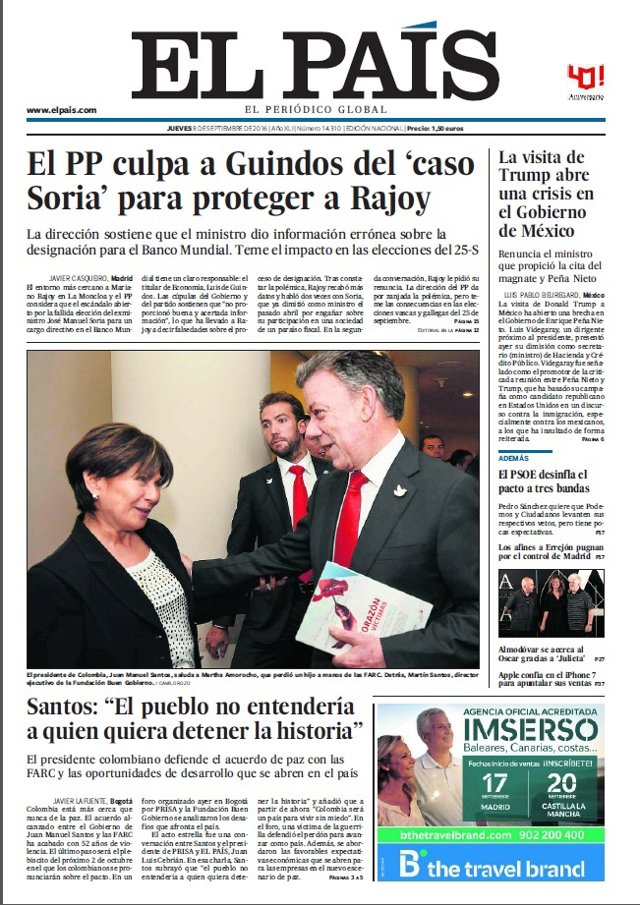 EL PAÍS: "El PP culpa a Guindos del 'caso Soria' para proteger a Rajoy. La dirección sostiene que el ministro dio información errónea sobre la designación para el Banco Mundial"; "Santos: "El pueblo no entendería a quien quiera detener la historia""; "La visita de Trump abre una crisis en el Gobierno de México"; "El PSOE desinfla el pacto a tres bandas".