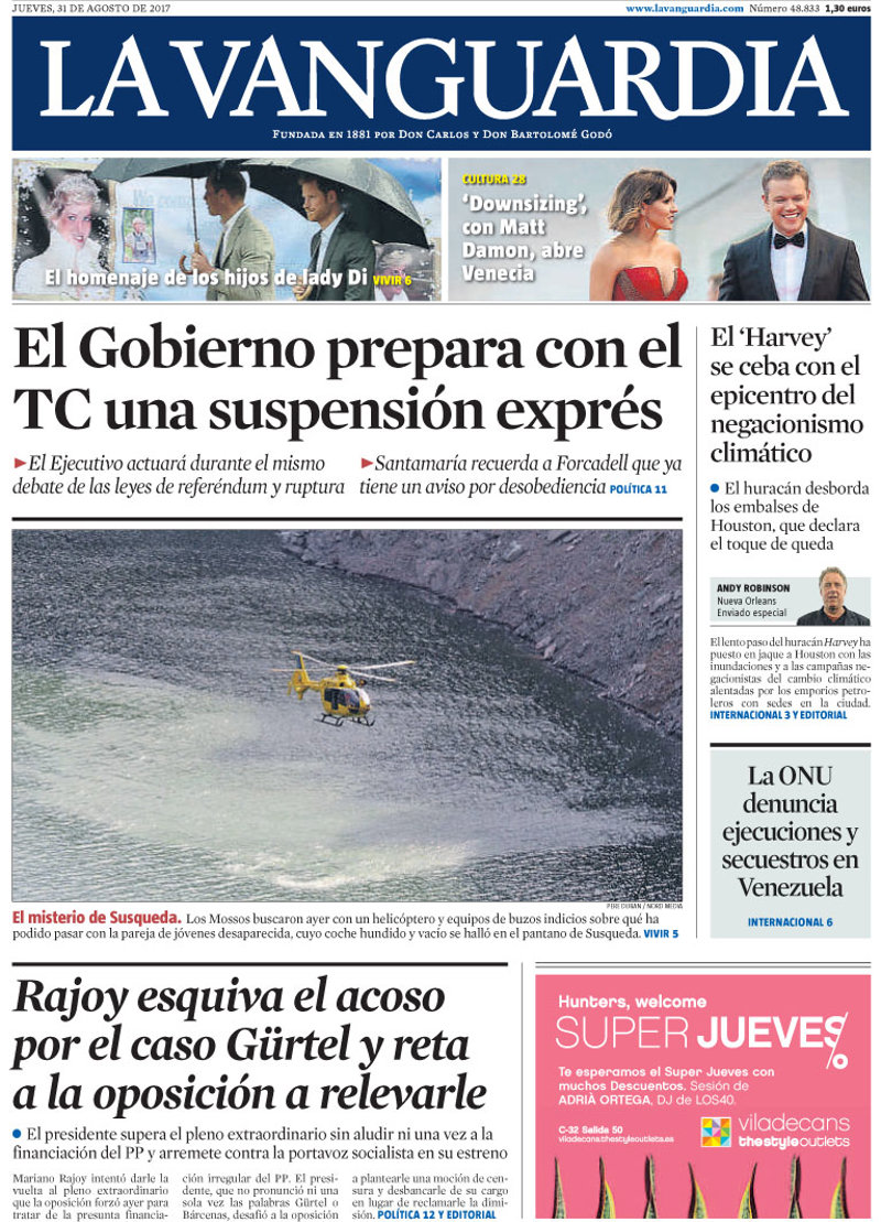 LA VANGUARDIA: "El Gobierno prepara con el TC una suspensión exprés"; "Rajoy esquiva el acoso por el caso Gürtel y reta a la oposición a relevarle"; "El 'Harvey' se ceba con el epicentro del negacionismo climático"; "La ONU denuncia ejecuciones y secuestros en Venezuela".