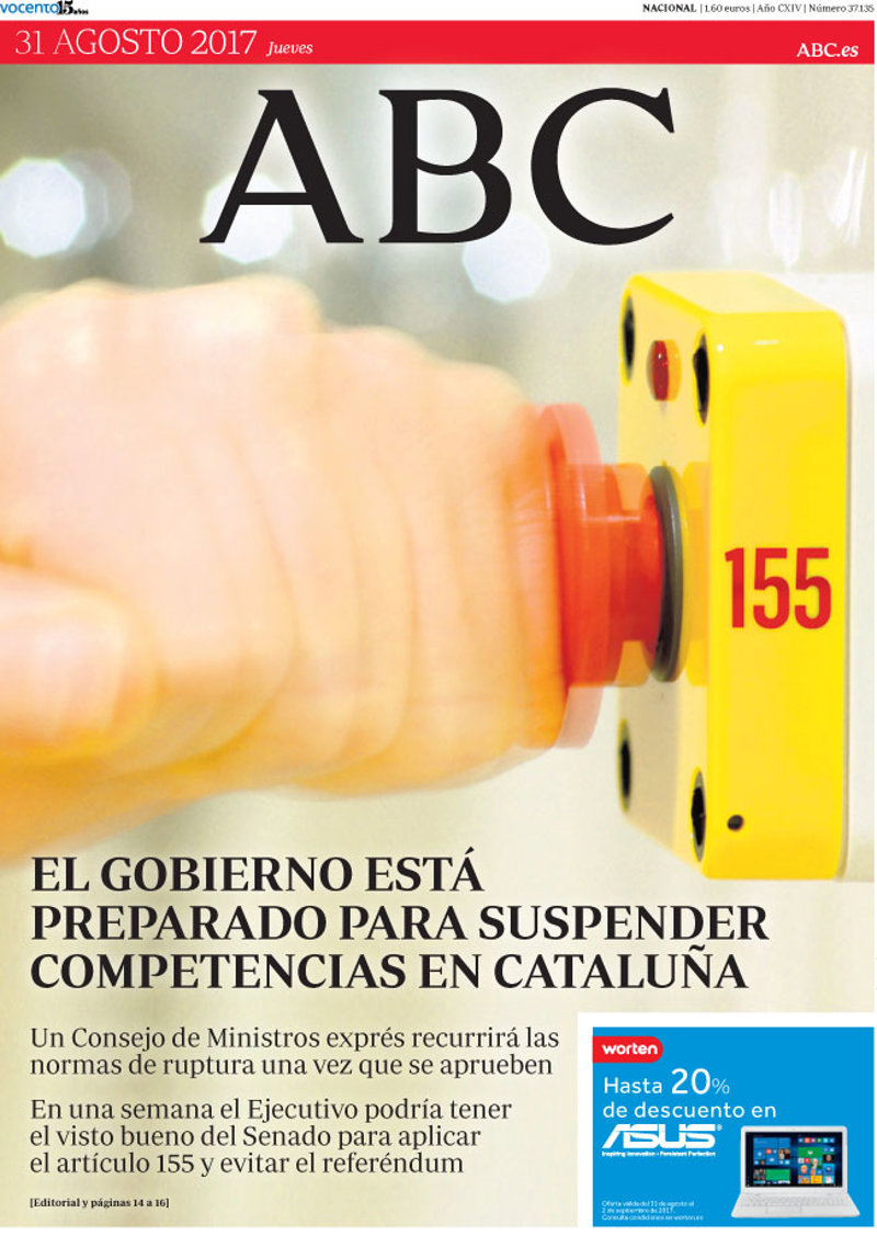 ABC: "El Gobierno está preparado para suspender competencias en Cataluña. Un Consejo de Ministros exprés recurrirá las normas de ruptura una vez que se aprueben. En una semana el Ejecutivo podría tener el visto bueno del Senado para aplicar el artículo 155 y evitar el referéndum".