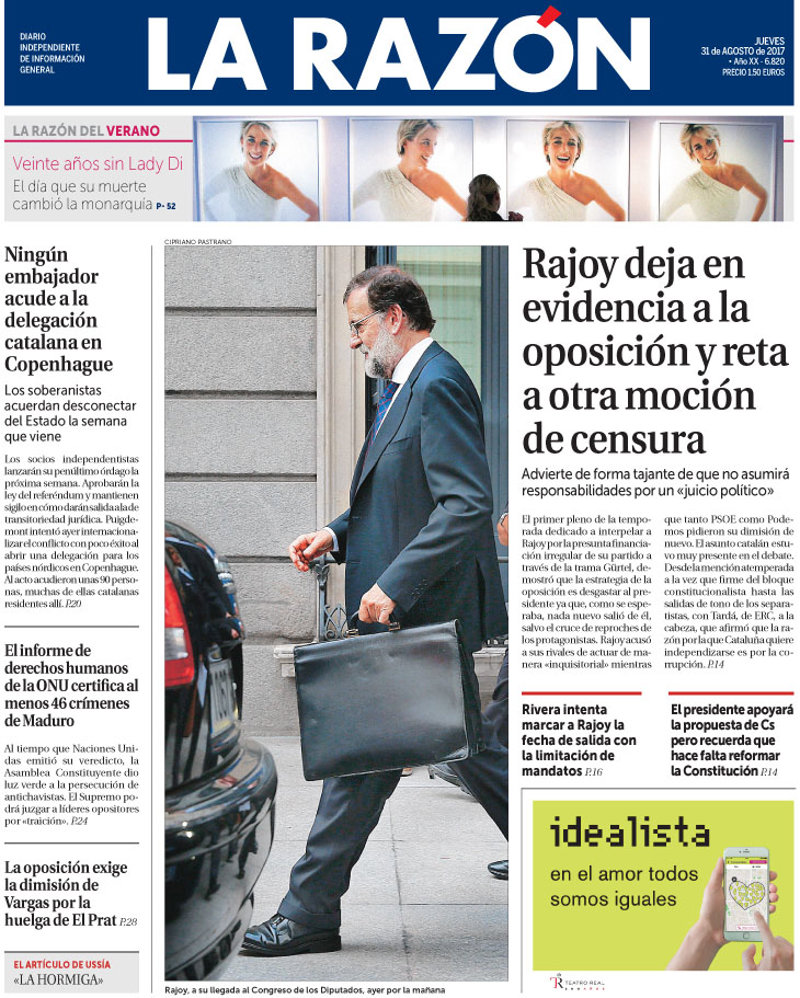 LA RAZÓN: "Rajoy deja en evidencia a la oposición y reta a otra moción de censura"; "Ningún embajador acude a la delegación catalana en Copenhague"; "El informe de derechos humanos de la ONU certifica al menos 46 crímenes de Maduro"; "La oposición exige la dimisión de Vargas por la huelga de El Prat".