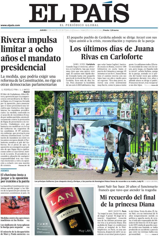 EL PAÍS: "Rivera impulsa limitar a ocho años el mandato presidencial"; "Los últimos días de Juana Rivas en Carloforte"; "Mi recuerdo del final de la princesa Diana. Sami Naïr fue hace 20 años el funcionario francés que tuvo que atender la tragedia"; "El chavismo insta a juzgar a la oposición por traición a la patria".