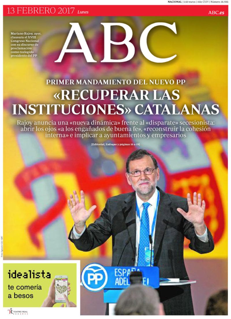 ABC: "Primer mandato del nuevo PP: "recuperar las instituciones" catalanas. Rajoy anuncia una "nueva dinámica" frente al *disparate* secesionista: abrir los ojos "a los engañados de buena fe", "reconstruir la cohesión interna" e implicar a ayuntamientos y empresarios.