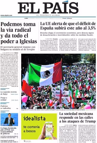 EL PAÍS: "Podemos toma la vía radical y da todo el poder a Iglesias"; "La UE alerta de que el déficit de España subirá este año al 3,5%"; "La sociedad mexicana responde en las calles a los ataques de Trump"; "Un Rajoy fortalecido pide al PSOE más responsabilidad de gobierno".