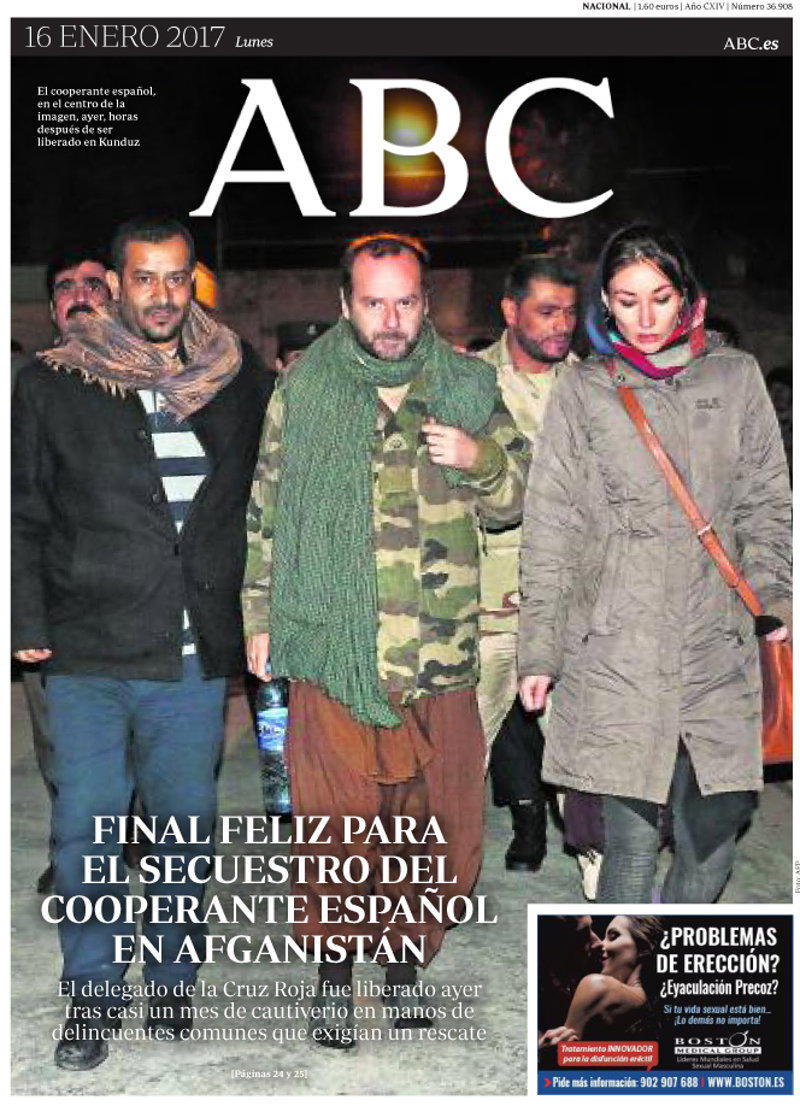 ABC: "Final feliz para el secuestro del cooperante español en Afganistán. El delegado de la Cruz Roja fue liberado ayer tras casi un mes de cautiverio en manos de delincuentes comunes que exigían un rescate".