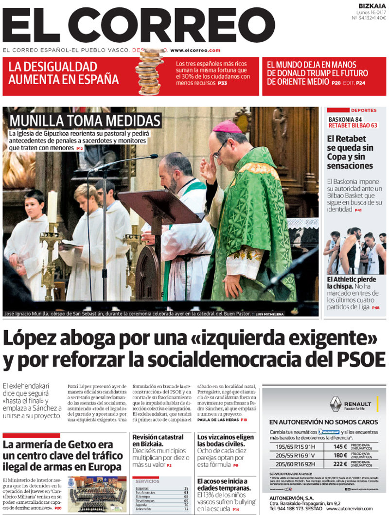 EL CORREO: "López aboga por una "izquierda exigente" y por reforzar la socialdemocracia del PSOE"; "La armería de Getxo eraun centro clave del tráfico ilegal de armas en Europa"; "Munilla toma medidas. La Iglesia de Gipuzkoa reorienta su pastoral y pedirá antecedentes de penales a sacerdotes y monitores que traten con menores".