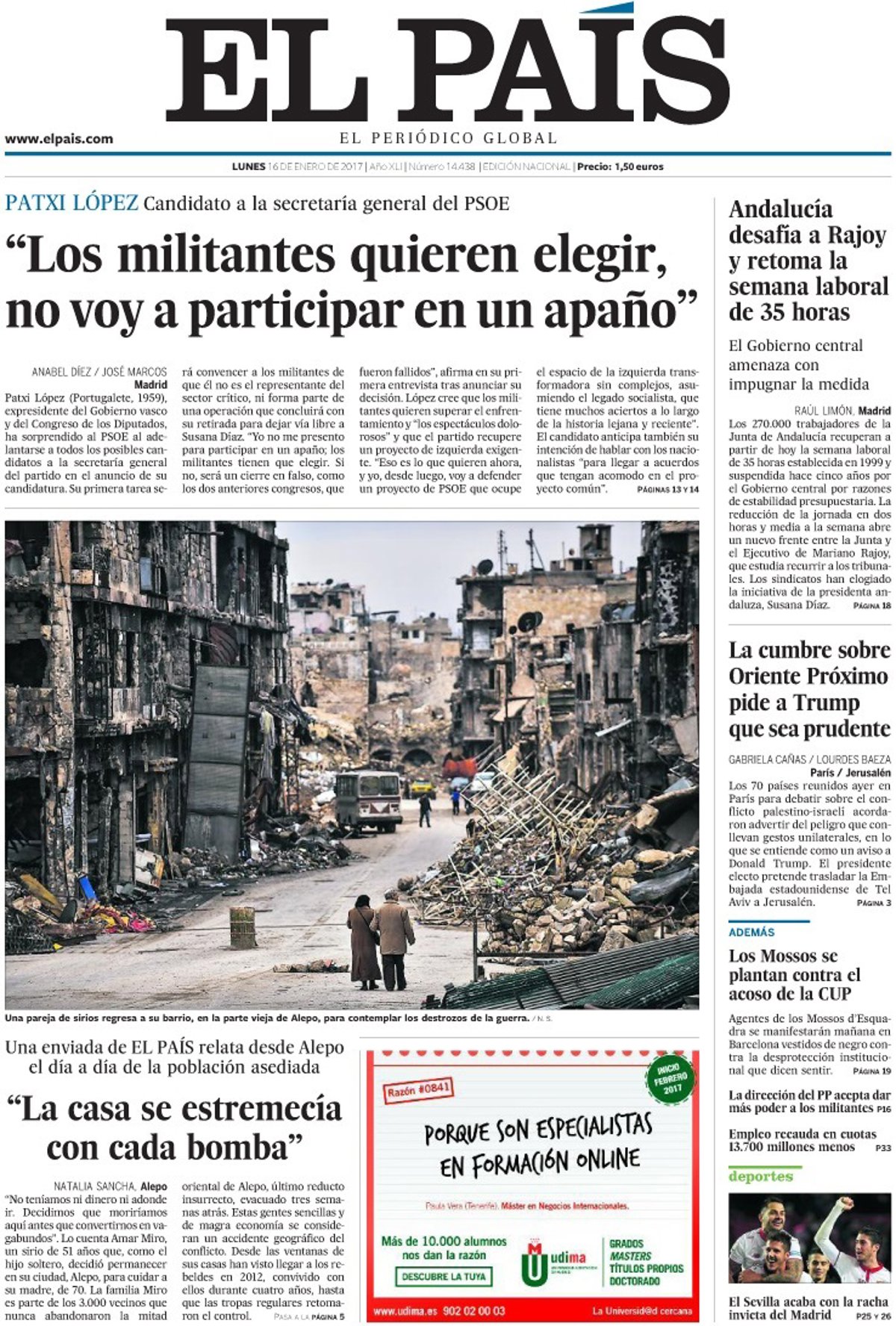 EL PAÍS: "Patxi López: "Los militantes quieren elegir, no voy a participar en un apaño"; "Andalucía desafía a Rajoy y retoma la semana laboral de 35 horas"; "La cumbre sobre Oriente Próximo pide a Trump que sea prudente"; "Los Mossos se plantan contra el acoso de la CUP".