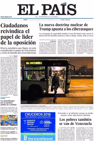 EL PAÍS: "Ciudadanos reivindica el papel de líder de la oposición"; "La nueva doctrina nuclear de Trump apunta a los ciberataques"; "Los pobres también se van de Venezuela"; "Los damnificados por la parálisis política de Cataluña".