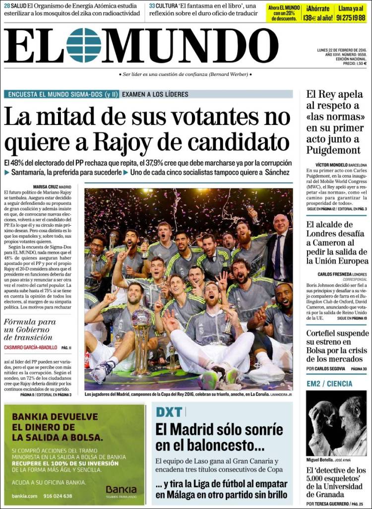 EL MUNDO: "Encuesta El Mundo Sigma Dos: La mitad de sus votantes no quieren a Rajoy de candidato"; "El Rey apela al respeto a las normas en su primer acto junto a Puigdemont"; "El alcalde de Londres desafía a Cameron al pedir la salida de la Unión Europea".