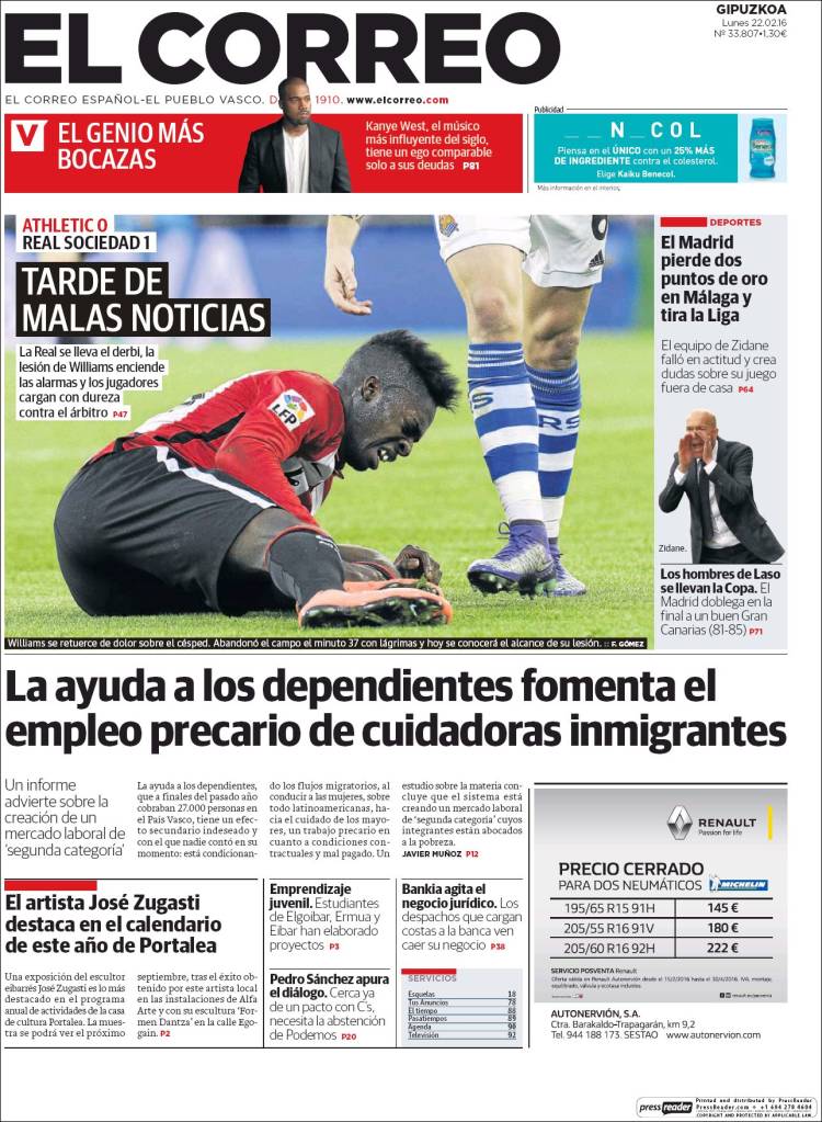 EL CORREO: "La obra en el puente de La Arena afectará a diario a 50.000 conductores"; "La ayuda a dependientes fomenta el empleo precario de cuidadoras inmigrantes"; "Intenta arrollar a dos ertzainas. Fue detenido después de que un agente disparara al aire".