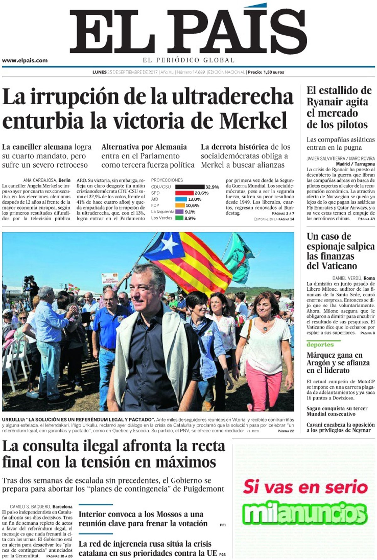 EL PAÍS: "La irrupción de la ultraderecha enturbia la victoria de Merkel"; "La consulta ilegal afronta la recta final con la tensión en máximos"; "Interior convoca a los Mossos a una reunión clave para frenar la votación"; "El estallido de Ryanair agita el mercado de los pilotos"; "Un caso de espionaje salpica las finanzas del Vaticano".