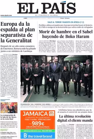 EL PAÍS: "Europa da la espalda al plan separatista de la Generalitat"; "Morir de hambre en el Sahel huyendo de Boko Haram"; "Colaboración "leal y generosa" en el Mobile"; "La restauración de la Sala de los Reyes de la Alhambra, en la recta final".