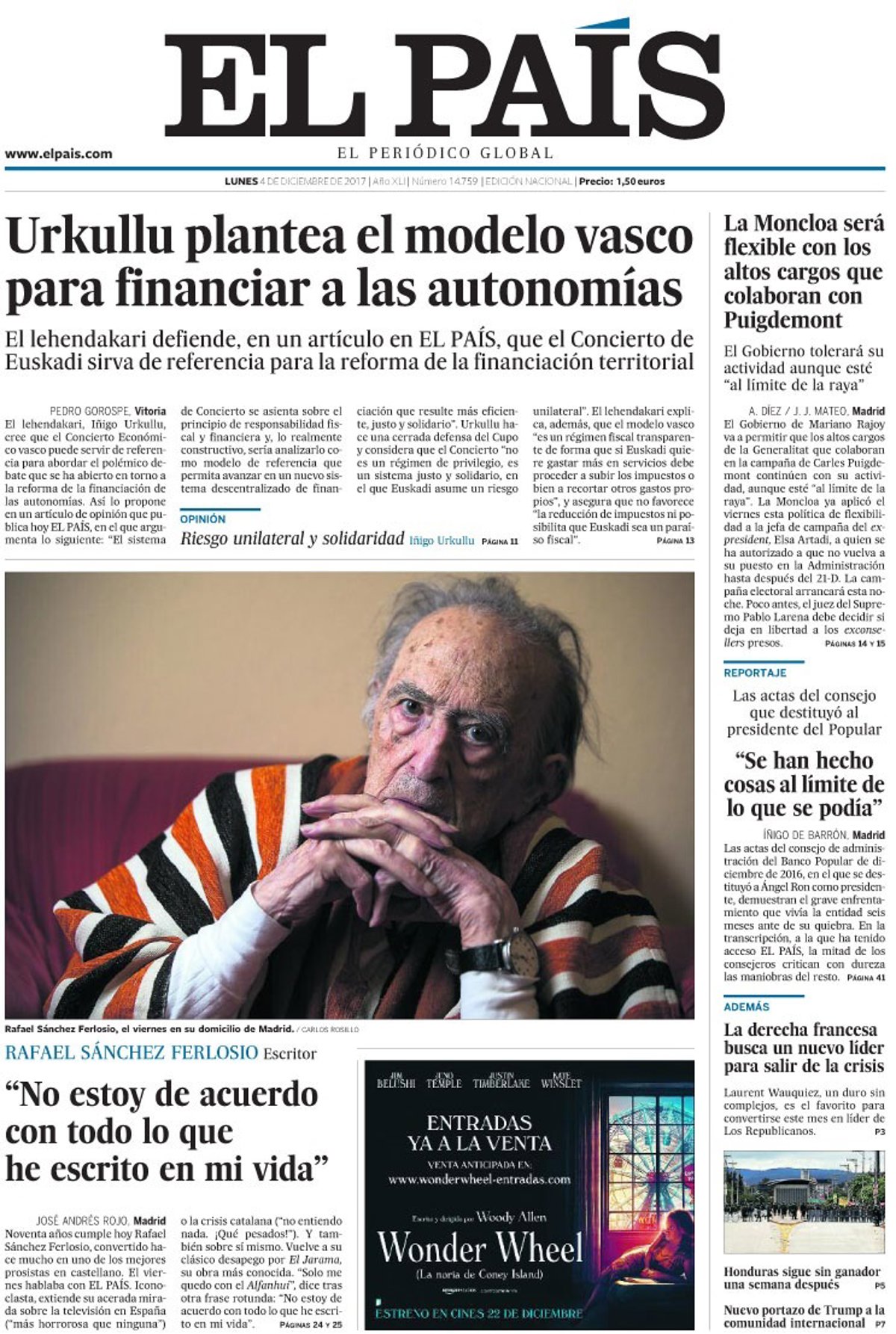 EL PAÍS: "Urkullu plantea el modelo vasco para financiar a las autonomías"; "La Moncloa será flexible con los altos cargos que colaboran con Puigdemont"; "Las actas del consejo que destituyó al presidente del Popular. "Se han hecho cosas al límite de lo que se podía"; "Rafael Sánchez Ferlosio: "No estoy de acuerdo con todo lo que he escrito en mi vida".