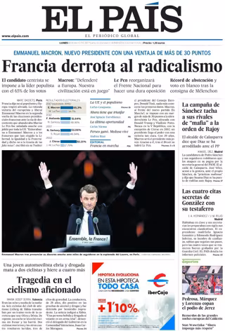 EL PAÍS: "Francia derrota al radicalismo. Emmanuel Macron, nuevo presidente con una ventaja de más de 30 puntos"; "Tragedia en el ciclismo aficionado. Una joven automovilista ebria y drogada mata a dos ciclistas y hiere a cuatro más"; "La campaña de Sánchez tacha a sus rivales de "mafia" a la orden de Rajoy"; "Las cuatro citas secretas de González con su testaferro".
