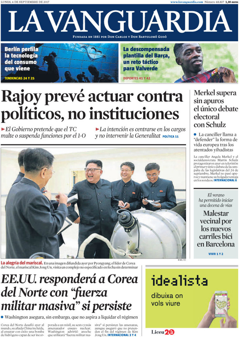 LA VANGUARDIA: "Rajoy prevé actuar contra políticos, no instituciones"; "EE.UU. responderá a Corea del Norte con "fuerza militar masiva" si persiste"; "Merkel supera sin apuros el único debate electoral con Schulz"; "Malestar vecinal por los nuevos carriles bici en Barcelona".