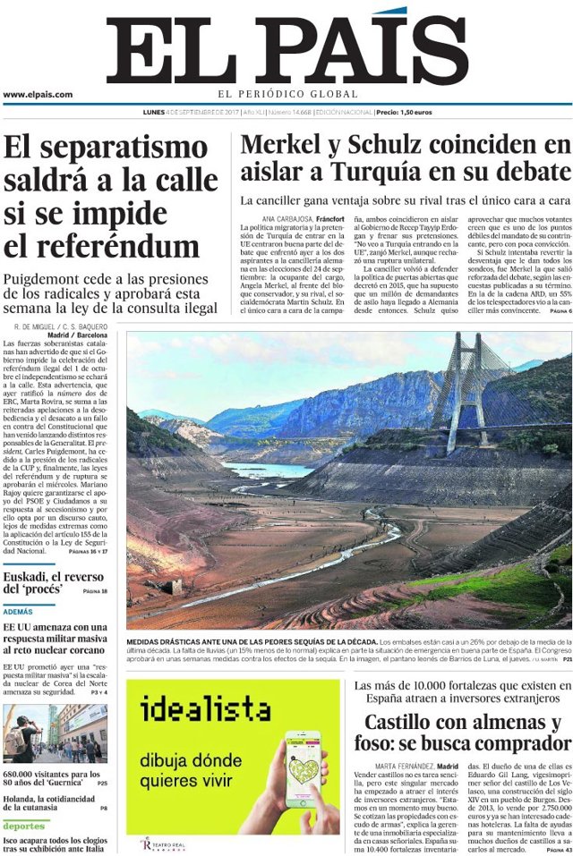 EL PAÍS: "El separatismo saldrá a la calle si se impide el referéndum"; "Merkel y Schulz coinciden en aislar a Turquía en su debate"; "Castillo con almenas y foso: se busca comprador. Las más de 10.000 fortalezas que existen en España atraen a inversores extranjeros"; "EE UU amenaza con una respuesta militar masiva al reto nuclear coreano".