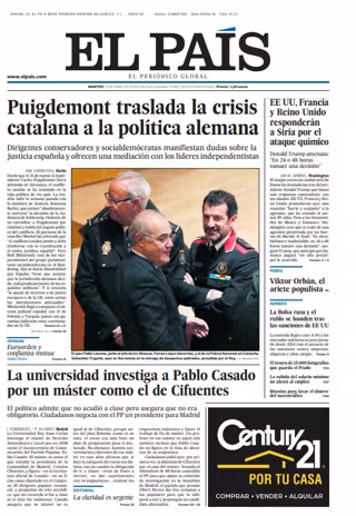 EL PAÍS: "Puigdemont traslada la crisis catalana a la política alemana"; "EEUU, Francia y Reino Unido responderán a Siria por el ataque químico"; "La universidad investiga a Pablo Casado