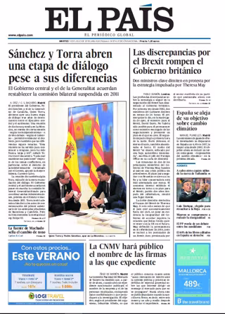 EL PAÍS: "Sánchez y Torra abren una etapa de diálogo pese a sus diferencias"; "Las discrepancias por el Brexit rompen el Gobierno británico"; "La CNMV hará público el nombre de las firmas a las que expediente"; "España se aleja de su objetivo sobre el cambio climático".