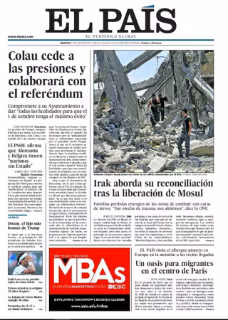 EL PAÍS: "Colau cede a las presiones y colaborará con el referéndum"; "Irak aborda su reconciliación tras la liberación de Mosul"; "Un oasis para inmigrantes en el centro de París. Visita el albergue pionero en Europa en la atención a los recién llegados"; "El PSOE afirma que Alemania y Bélgica tienen 'naciones sin Estado'".
