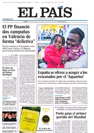 EL PAÍS: "El PP financió dos campañas en Valencia de forma 'delictiva'"; "España se ofrece a acoger a los rescatados por el 'Aquarius'"; "Putin gana el primer partido del Mundial"; "El Gobierno promete más ambición contra el cambio climático".