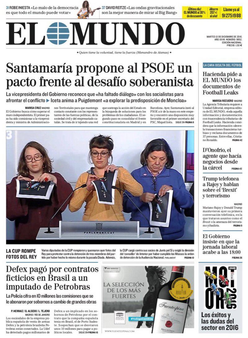 EL MUNDO: "Santamaría propone al PSOE un pacto frente al desafío soberanista"; "Defex pagó por contratos ficticios en Brasil a un imputados de Petrobas"; "Hacienda pide a El Mundo los documentos de Football Leaks"; "Trump telefonea a Rajoy y hablan sobre el 'Brexis' y terrorismo".