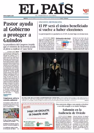 EL PAÍS: "Pastor ayuda al Gobierno a proteger a Guindos. La presidenta del Congreso impide que el ministro de Economía acuda al pleno a explicar el 'caso Soria'"; "El PP será el único beneficiado si vuelve a haber elecciones"; "Un Otello del siglo XXI para el bicentenario del Teatro Real"; "Salomón en la Audiencia de Oviedo. Una sentencia obliga a una pareja a devolver a un niño acogido a su madre biológica"; "Puigdemont enfría la consulta unilateral".
