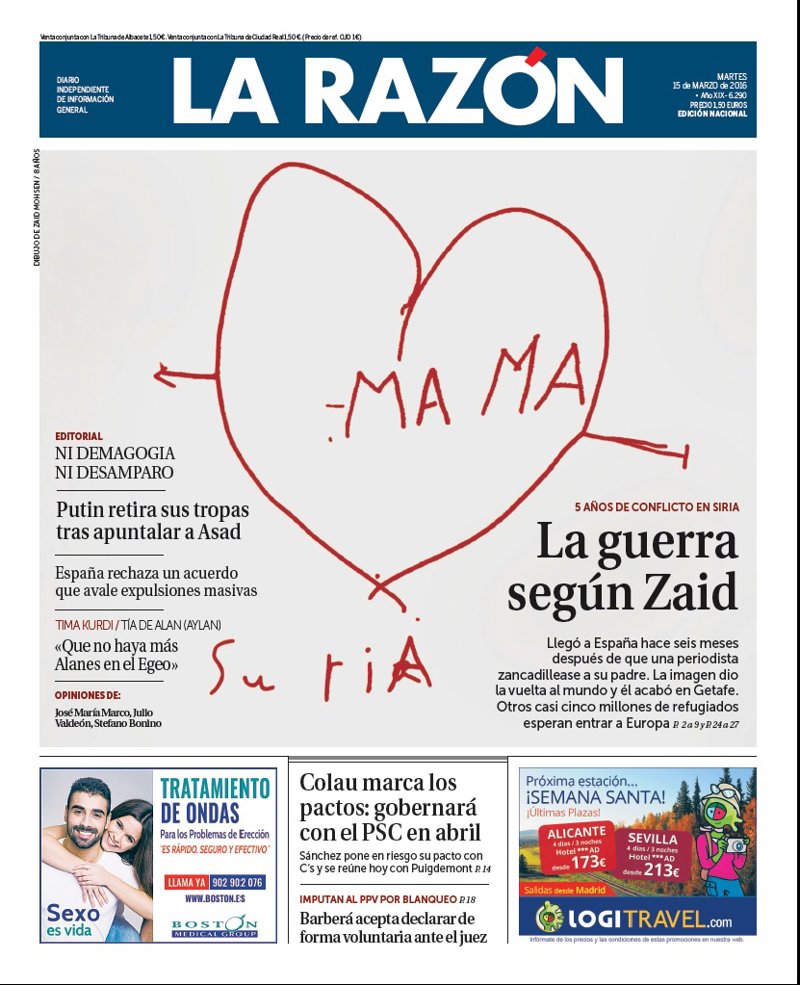 LA RAZÓN: "La guerra según Zaid. Llegó a España hace seis meses después de que una periodista zancadillease a su padre. Otros casi cinco millones de refugiados esperan entrar a Europa"; "Putin retira sus tropas tras apuntalar a Asad"; "Colau marca los pactos: gobernará con el PSC en abril"; "Barberá acepta declarar de forma voluntaria ante el juez".