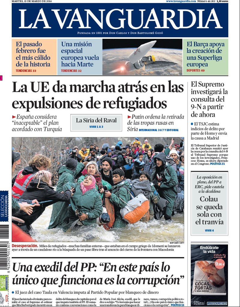 LA VANGUARDIA: "La UE da marcha atrás en las expulsiones de refugiados"; "Una exedil del PP: "En este país lo único que funcionaes la corrupción"; "El Supremo investigará la consulta del 9-N a partir de ahora"; "El pasado febrero fue el más cálido de la historia"; "El Barça apoya la creación de una Superliga europea".