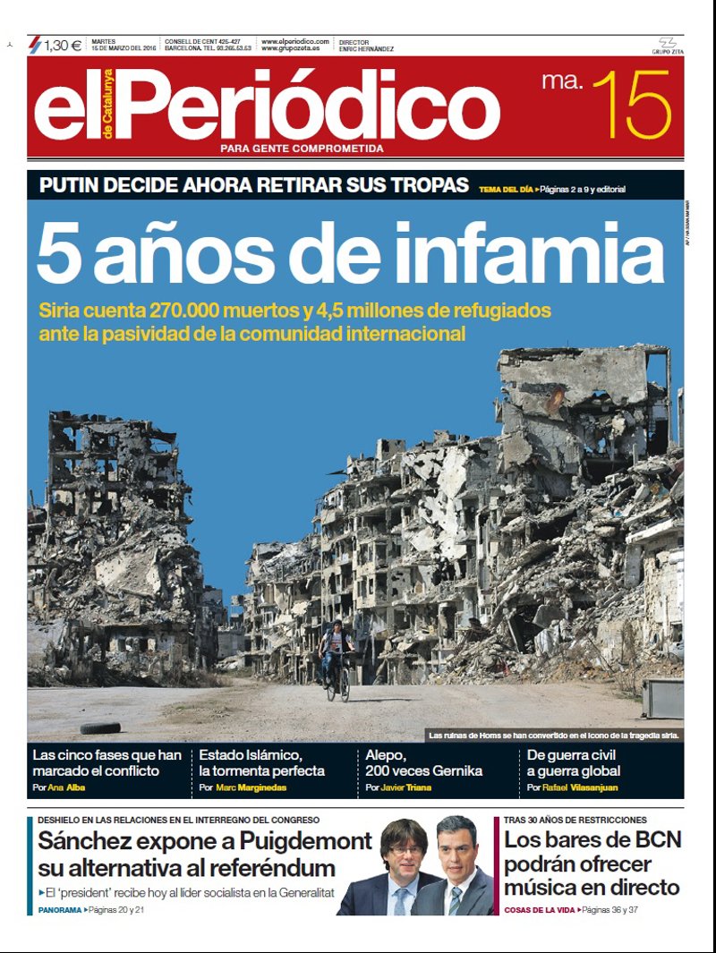 EL PERIÓDICO: "5 años de infamia. Siria cuenta 270.000 muertos y 4,5 millones de refugiados ante la pasividad de la comunidad internacional"; "Sánchez expone a Puigdemont su alternativa al referéndum"; "Los bares de Barcelona podrán ofrecer música en directo".