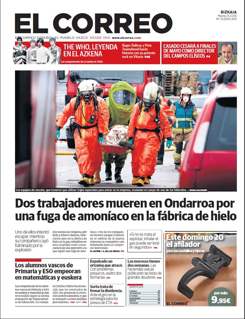 EL CORREO: "Dos trabajadores mueren en Ondarroa por una fuga de amoníaco en la fábrica de hielo"; "Los alumnos vascos de Primaria y ESO empeoran en matemáticas y euskera"; "Expulsado un ertzaina con problemas psíquicos que asaltó dos farmacias"; "Sortu trata de frenar la disidencia. Ante el giro en la estrategia para los presos de ETA".