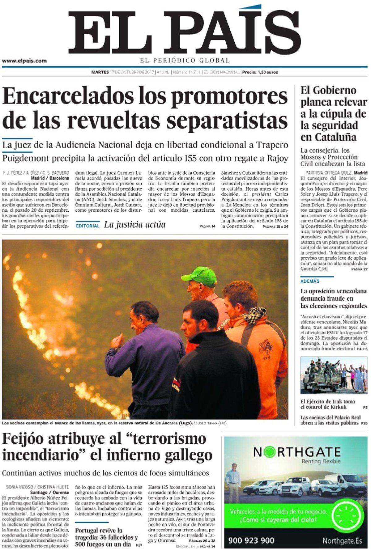 EL PAÍS: "Encarcelados los promotores de las revueltas separatistas"; "El Gobierno planea relevar a la cúpula de la seguridad en Cataluña"; "Feijóo atribuye al "terrorismo incendiario" el infierno gallego"; "La oposición venezolana denuncia fraude en las elecciones regionales".