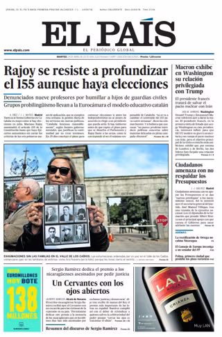 EL PAÍS: "Rajoy se resiste a profundizar el 155 aunque haya elecciones"; "Macron exhibe en Washington su relación privilegiada con Trump"; "Ciudadanos amenaza con no respaldar los Presupuestos"; "Un Cervantes con los ojos abiertos"; "La rectificación de Ortega no calma Nicaragua".
