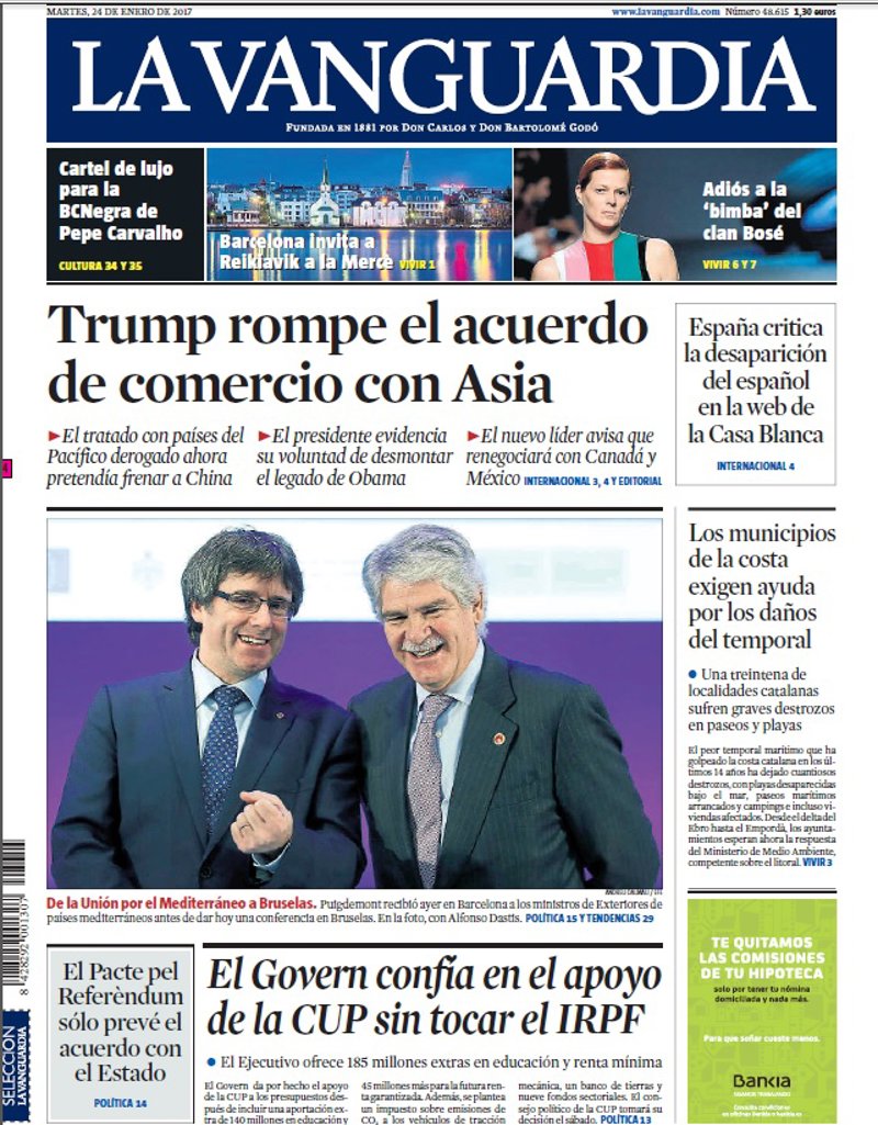 LA VANGUARDIA: "Trump rompe el acuerdo de comercio con Asia"; "España critica la desaparición del español en la web de la Casa Blanca"; "De la Unión por el Mediterráneo a Bruselas"; "Los municipios de la costa exigen ayuda por los daños del temporal"; "El Pacte pel Referèndum sólo prevé el acuerdo con el Estado"; "El Govern confía en el apoyo de la CUP sin tocar el IRPF".