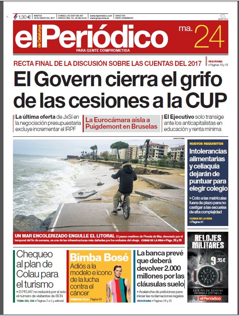 EL PERIÓDICO: "El Govern cierra el grifo de las cesiones a la CUP. La Eurocámara aísla a Puigdemont en Bruselas"; "Un mar encolerizado engulle el litoral"; "Intolerancias alimentarias y celiaquía dejarán de puntuar para elegir colegio"; "Chequeo al plan de Colau para el turismo"; "Bimba Bosé. Adiós a la modelo e icono de la lucha contra el cáncer"; "La banca prevé que deberá devolver 2.000 millones por las cláusulas suelo".