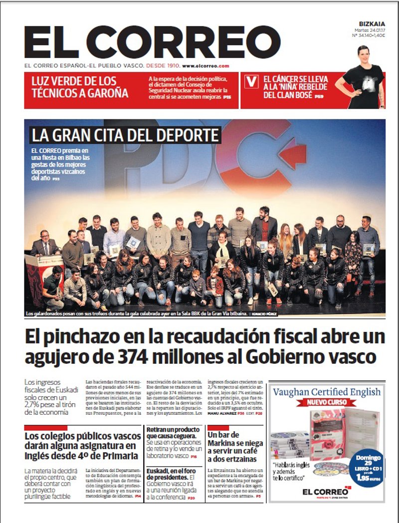 EL CORREO: "La gran cita del deporte. El Correo premia en una fiesta en Bilbao las gestas de los mejores deportistas vizcaínos del año"; "El pinchazo en la recaudación fiscal abre un agujero de 374 millones al Gobierno vasco"; "Los colegios públicos vascos darán alguna asignatura en inglés desde 4º de Primaria".